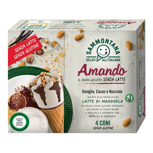 Descrizione Gelato alla vaniglia con latte di mandorla, con cialda, copertura al cacao magro, variegatura al cacao e nocciole e granella di mandorle.