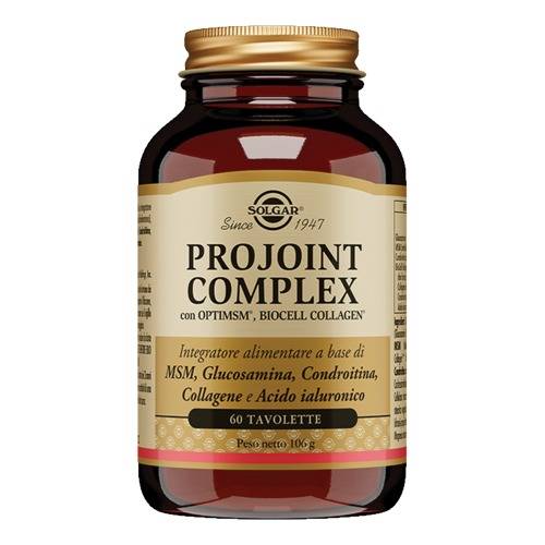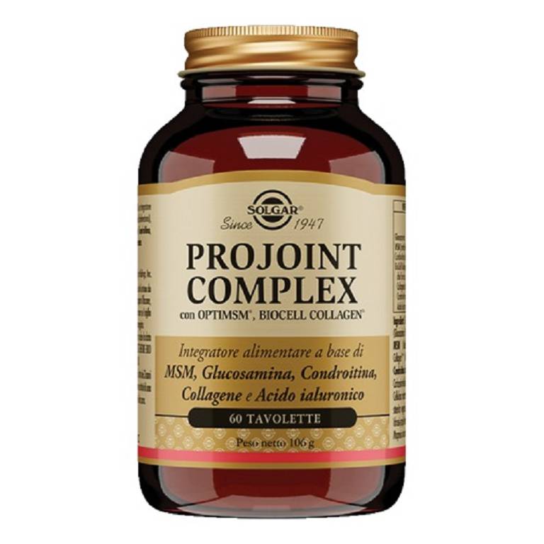 PROJOINT COMPLEX Integratore alimentare a base di MSM (metilsulfonilmetano), composto organico contenente Zolfo, in associazione a Glucosamina e Condroitina, costituenti del tessuto cartilagineo articolare e il brevetto Biocell Collagene II che fornisce Collagene idrolizzato tipo II, condroitin solfato e acido ialuronico, costituenti del tessuto cartilagineo articolare.